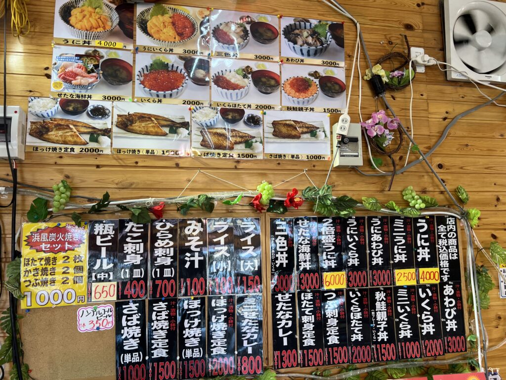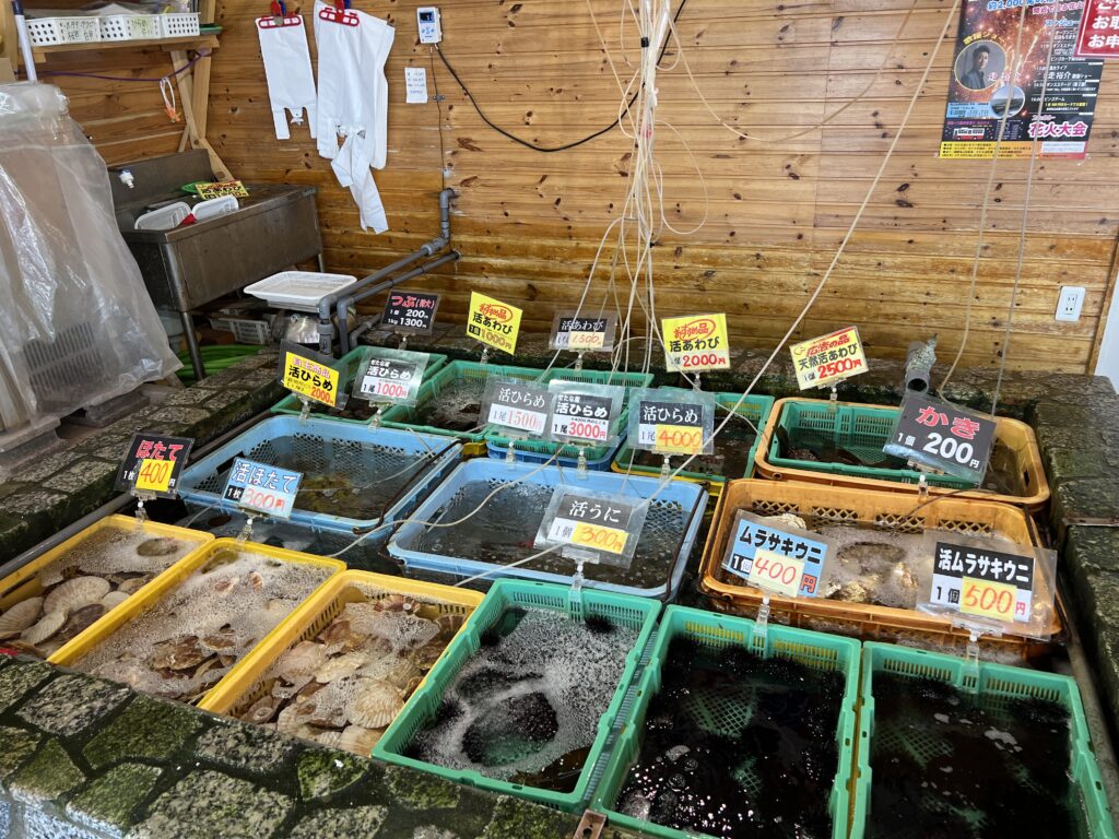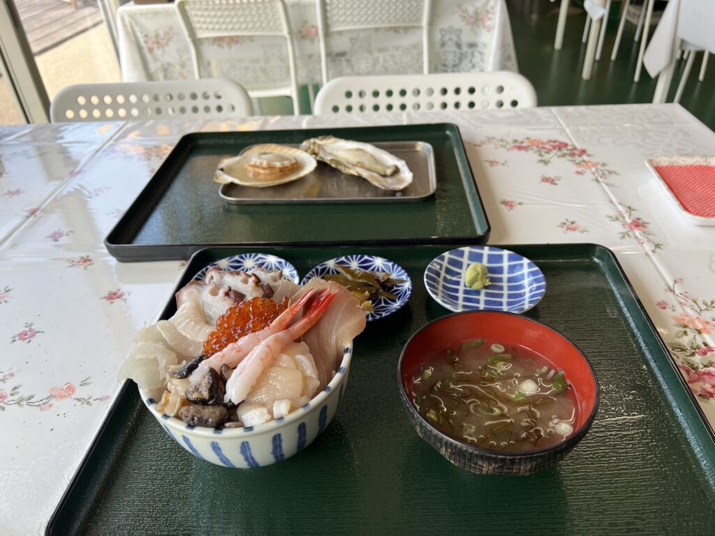 一時間ほど走って辿り着いた店先には、生簀が並んでいた。ウニ、ホタテ、牡蠣。どれも北海道の海そのものみたいな顔をしている。好きなものを選んで焼くこともできるらしいが、この日の僕は海鮮丼にした。追加で牡蠣とホタテをオーダーした。